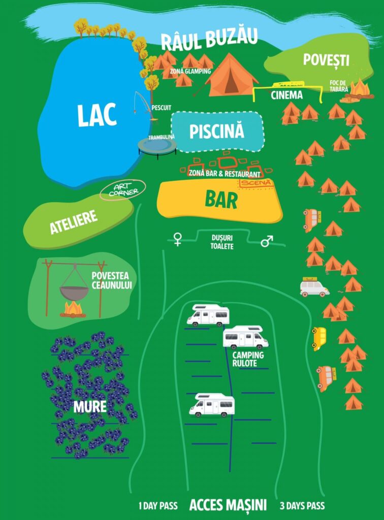 Include: taxa de campare și parcare, cina sâmbătă seara, 4 workshopuri cu sesiuni de Q&A cu Dr Cezar, teatru, foc de tabară, concerte & mix sessions, 3 sesiuni de yoga, meditație ghidată, baie în râu, tehnici de respirație, spectacol de foc, african drums jam, capoeira, goodbye drink + bonus – accesul la piscină